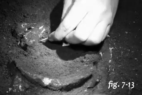 Virtually every news organization and every scientific society such as National Geographic and NOVA, and every museum of natural history in the world accepted both conclusions without question. In fact, these astounding conclusions are never questioned; they are promoted. They are part of the illusion. The cave-o-nauts spent three weeks retrieving bones. The skull (fig. 7-12), was buried with its half-round edge perfectly exposed in the surface dirt. How did it get buried in such a perfect yet strange fashion? It looks like someone buried it, then took his finger and wiped the top edge clean. It doesn’t look like some random event happened that caused the burying of the skull. Maybe it was just some sort of crazy luck. Why wasn’t the mandible (lower jaw) buried with the skull? How could one major part of the skull be buried, but not the other?