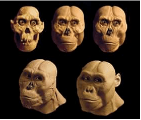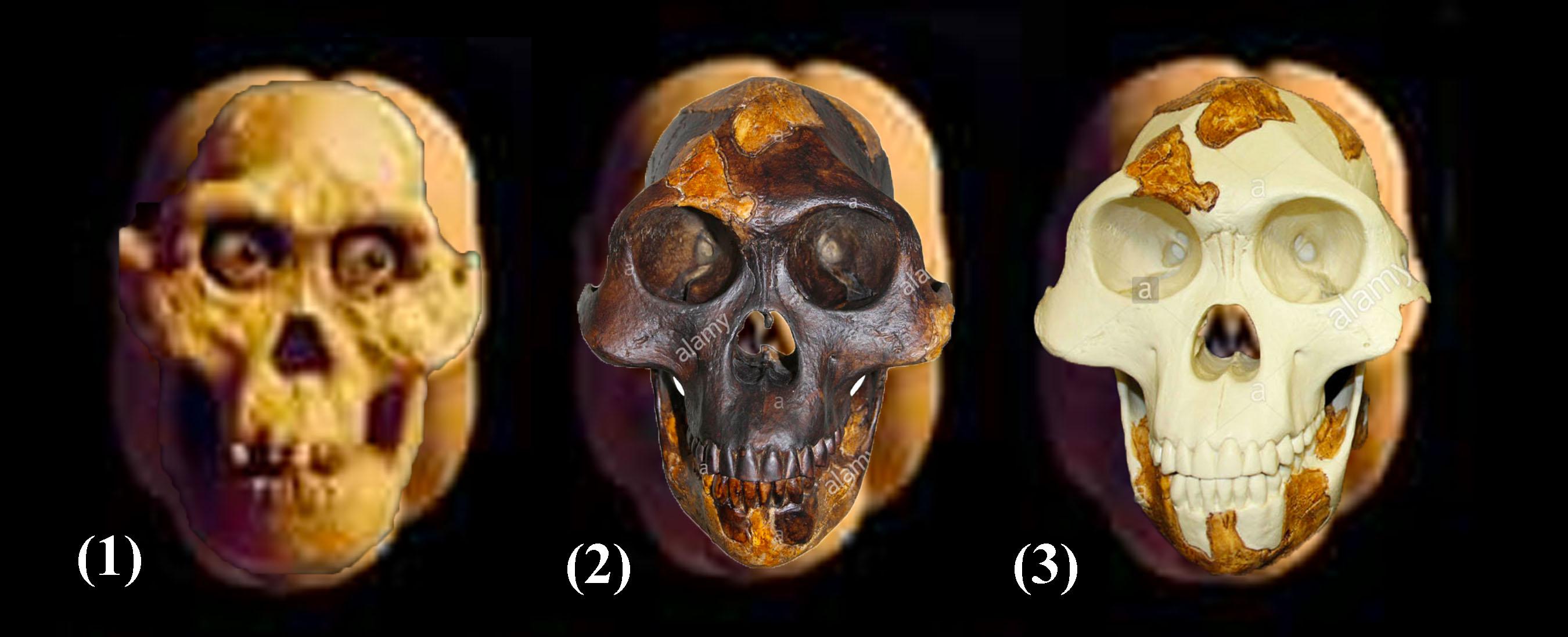 (2) and (3) are fossil skulls made with the actual bones found of Lucy (A. afarensis). Of course, filled in by expert modelers. I used two different “fossil” skulls as well as the skull used by your modelers.