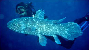 “The Coelacanth is a living fish which first appeared 410 million years ago. (Fossil above left) It was thought extinct, but recently has been found live in many locations throughout the world. (Above right) Coelacanth shows absolutely no sign of evolution since it first appeared”