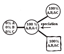 Each bio-logical system is made up of many different entities. Imagine a species in the process of forming bio-logical systems such as an eye/optic nerve/visual cortex/code/oculomotor system, or heart/lung/blood/vessel/nerve/controller system. For simplicity, the diagram at left uses three systems labeled A, B, and C. It really matters not which systems we example, as the problems are pertinent to all systems. At the time of major evolution of bio-logical systems, there would naturally be several organs and bio-logical systems in the process of inventing and assembling themselves. There would never be just one bio-logical system forming completely independently and isolated from all other bio-logical systems unless some sort of direction was involved. Nature in the form of non-occurring good mutations and supernatural selection cannot perform such a perfect series of isolated tasks. Plus, each part of any system is co-dependent on other parts. Does an eye need oxygenated blood to survive? I am sure that all evolutionauts will agree that speciation events and the full evolution of any system could not have been timed so that an organ or part of a system begins and completes its formation, cleanly and purposefully followed by a speciation event as shown in the diagram above. Speciation events could not possibly be timed exactly with the beginning and completion of the formation of multiple organ systems. The scenario in the diagram could not have happened. That’s pretty unarguable.