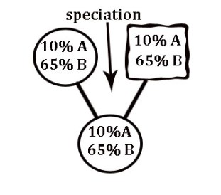 evolving similar systems, or anything or nothing for that matter, could not coalesce and form one species. The evolving organs in those two species could not coalesce into single organs or systems either. The diagram at left, shows a scenario that could not be in the mix; it couldn’t happen. Different species cannot procreate with each other. There is no mechanism in nature that would allow two different species populations to coalesce into one, with each filling in or adding to the missing organs and bio-logical systems of the other.