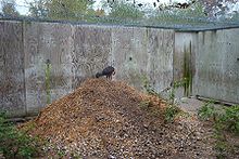 The Megapode bird of New Guinea, north of Australia, makes a 12-foot-high pile of vegetation. The bird is about a foot tall, so this is like a six-foot-tall person building a seventy-foot-tall building.  A smaller megapode nest is at left. •The mallee fowl, the best known of the group of megapodes, is about two feet long and has white-spotted, light brown plumage.  The male builds a mound of decaying vegetation, which may require 11 months to construct. The result is a low mound, about three feet in the ground and up to five feet across, made up of twigs and leaves soaked with rain and covered with a foot and half of sandy soil. When the heat of fermentation inside the mound reaches 91° F, the female lays the first of about 35 eggs in a central chamber. The male maintains a nest temperature amazingly close to 91° F even when there is daily and seasonal weather variation. Mallee eggs hatch in seven weeks, and the hatchlings dig upward through the mound and run off on their own. They can fly one or two days after hatching.